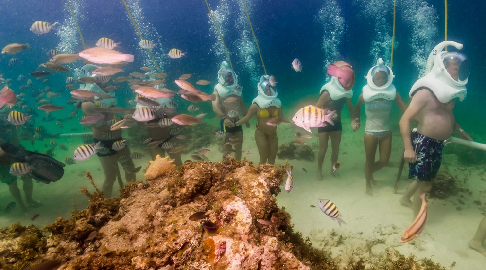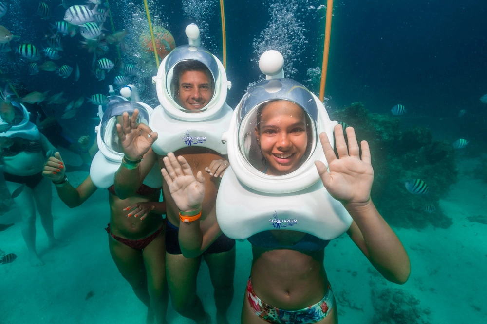 Seaquarium is a water-based excursion located in the Bávaro–Punta Cana area that allows visitors to descend into the ocean using a helmet-style diving bell. This helmet provides constant airflow and clear visibility while you walk on the ocean floor just a few meters below the surface.