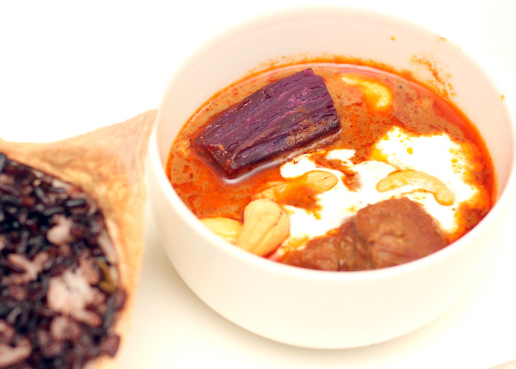 Signature Dish: Massaman Lamb — Australian lamb slow-cooked in coconut milk, Massaman curry paste, tamarind juice, palm sugar, sweet purple potato, and toasted nuts.