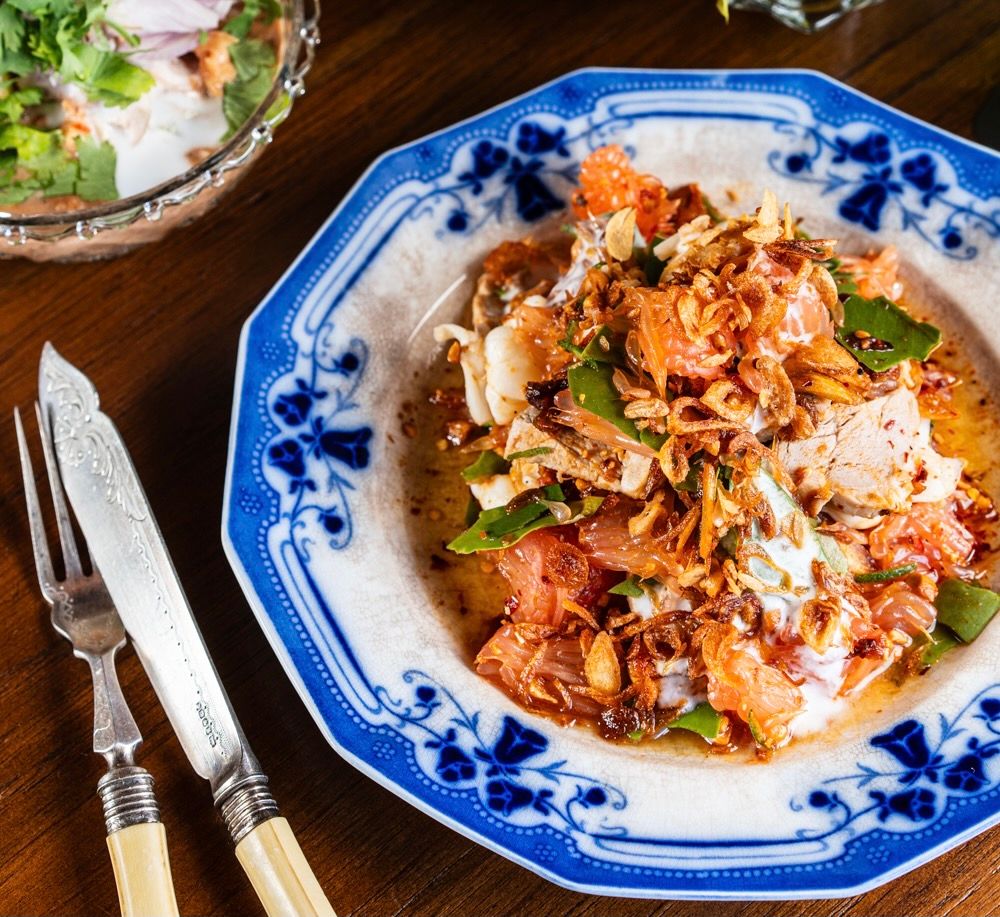 Signature Dish: Khao Uum — a traditional southern Thai rice salad served with an artistic arrangement of ingredients: jasmine rice, torch ginger flowers, lemongrass, wing beans, toasted coconut, and more, complemented by an aromatic fish dressing.